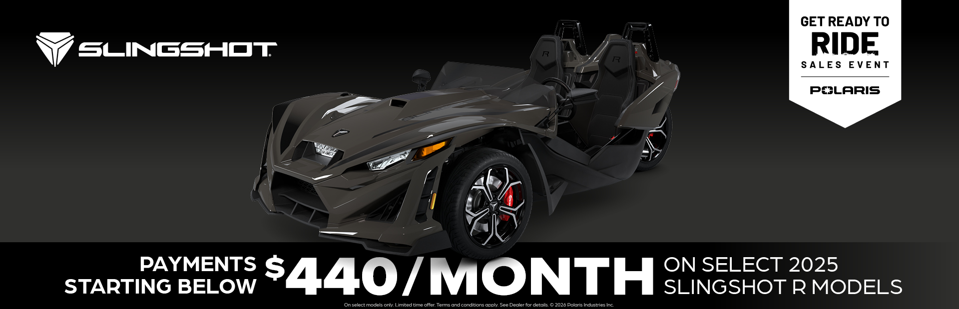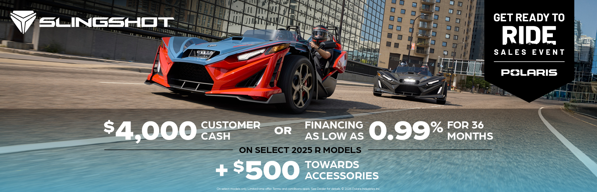This is a limited time offer which consists of $4,000 Customer Cash rebate towards the purchase of new model year 2025 R Slingshot. This offer is subject to change and may be extended or terminated without further notice. Offer may not be combined with promotional financing on Slingshot R models. All rebates paid to dealer and are not redeemable for cash. The $4,000 customer cash offer is specific to 2025 Slingshot R models. Offer Valid: March 1 – 31, 2026.