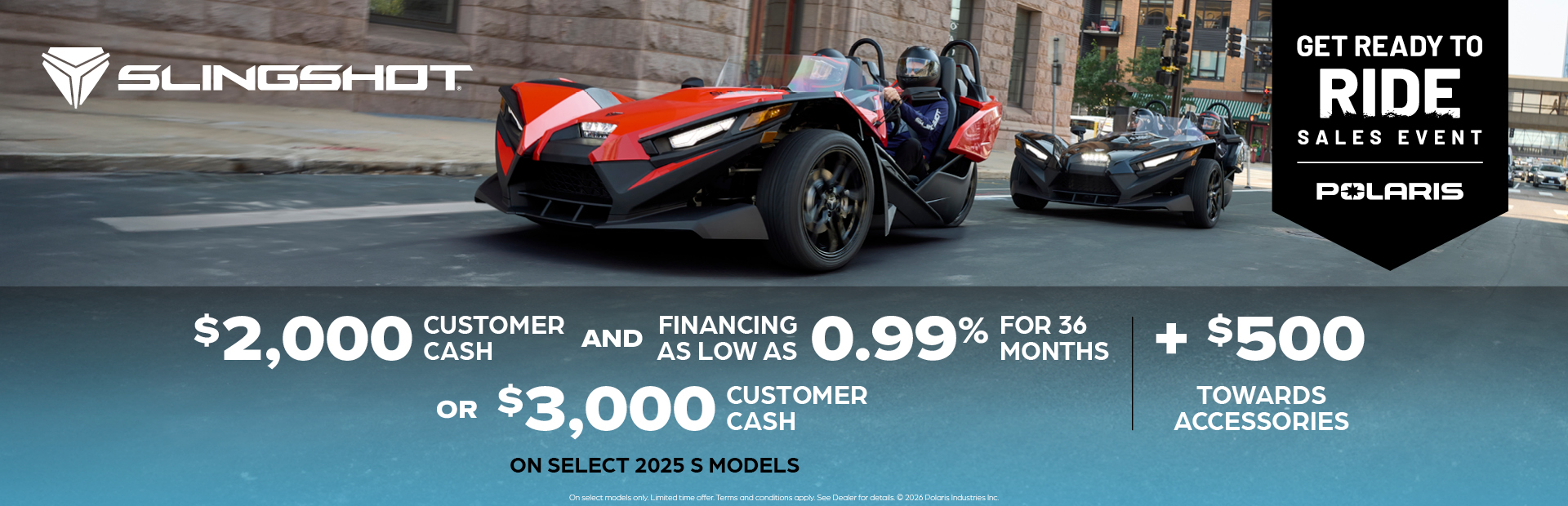 This is a limited time offer which consists of $3,000 Customer Cash rebate towards the purchase of new model year 2025 S, SL, and SLR Slingshots. This offer is subject to change and may be extended or terminated without further notice. Offer may not be combined with promotional financing on Slingshot SL or SLR models. All rebates paid to dealer and are not redeemable for cash. The $3,000 customer cash offer is specific to 2025 Slingshot S, SL, or SLR models. Offer Valid: March 1 – 31, 2026.